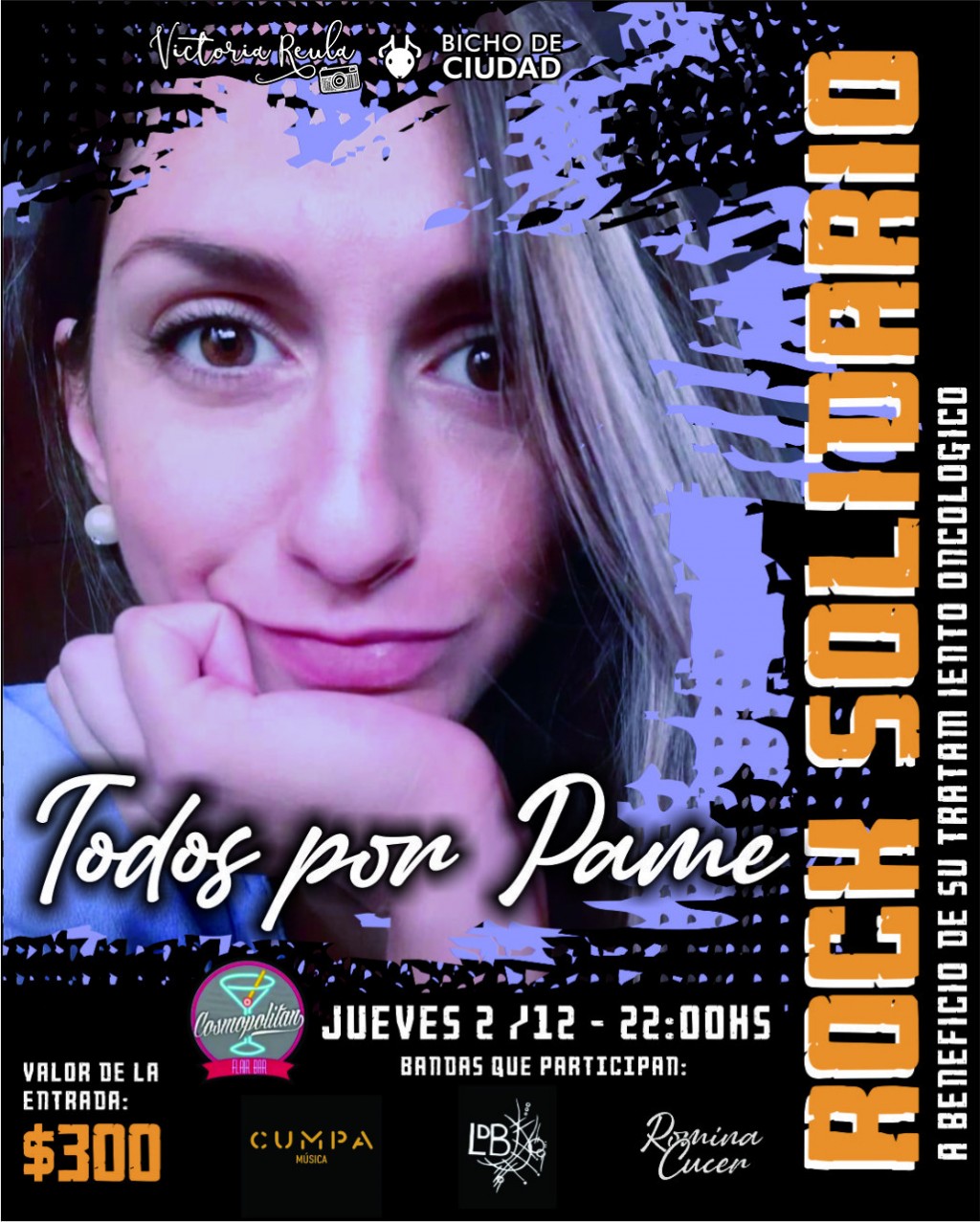 Pamela Benítez es de Paraná, tiene de 30 años y debe reanudar un tratamiento oncológico que es sumamente costoso. Para afrontar dicha terapia, necesita disponer de 1,2 millones de pesos cada 21 días. Por ese motivo decidimos colaborar y acompañar, con músicos de diversos géneros, que se unifican para brindar un ciclo de shows consecutivos. Los mismos se desarrollarán en Cosmopolitan, ubicado en Güemes 1356. Y tendrá la siguiente grilla:.