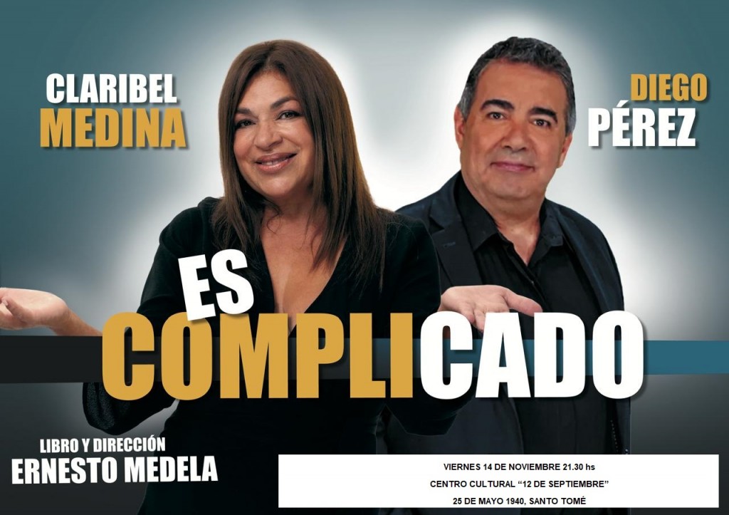 El reconocido dúo compuesto por Claribel Medina y Diego Pérez llega a Santo Tomé con la comedia romántica “Es Complicado”, escrita y dirigida por Ernesto Medela. La función será el viernes 14 de noviembre a las 21.30 horas en el Centro Cultural “12 de Septiembre”.