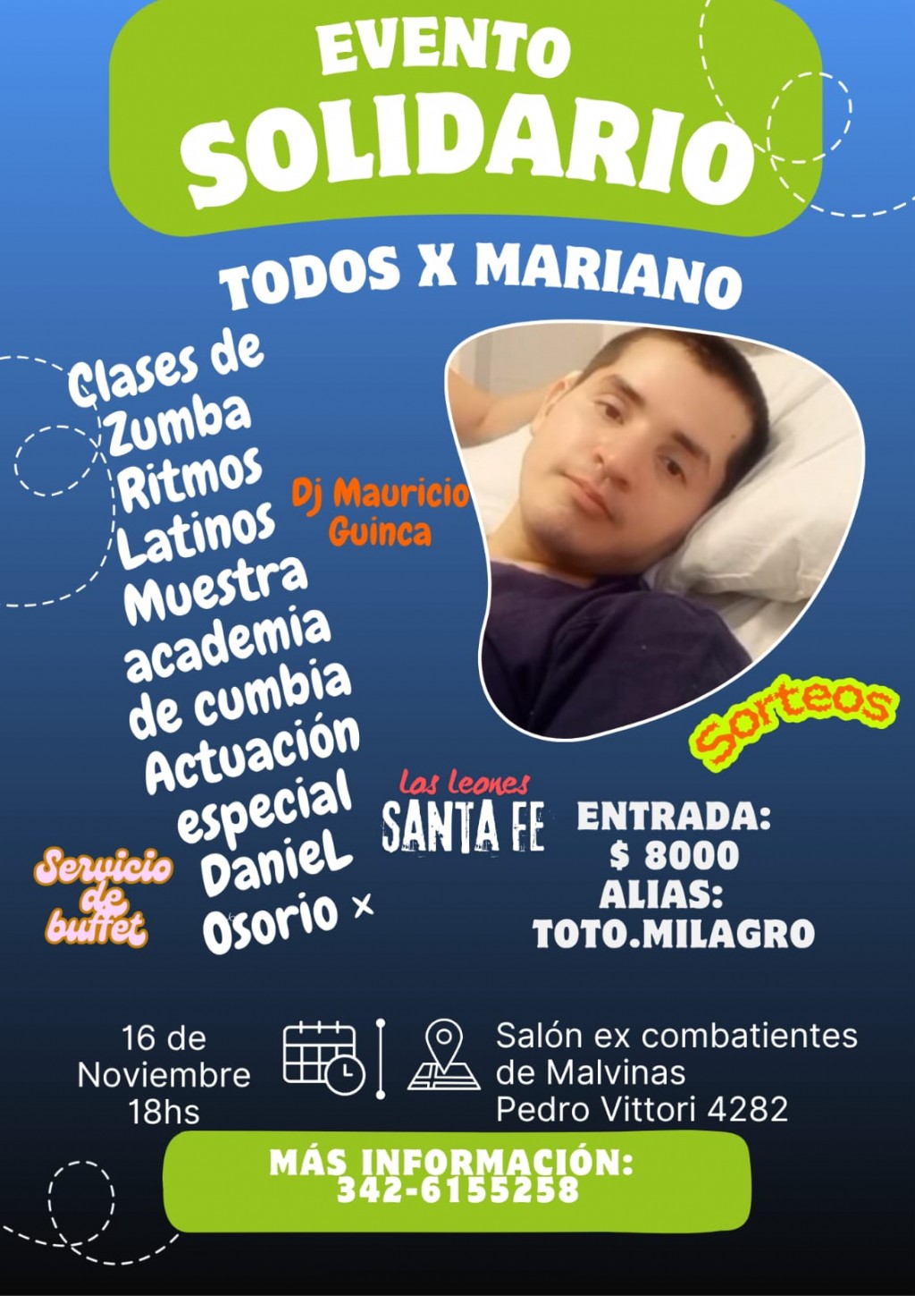 el pr}´ximo domingo 16 de noviembre se llevará a cabo el evento solidario "TODOS X MARIANO". El eveto comenzará a las 18 horas en el SALON DE LOS EXCOMBATIENTES DE MALVINAS en Pedro Vittori 4282.