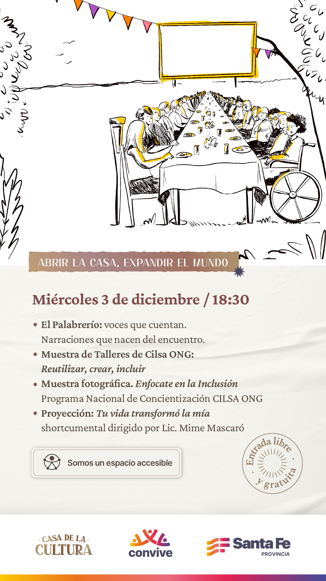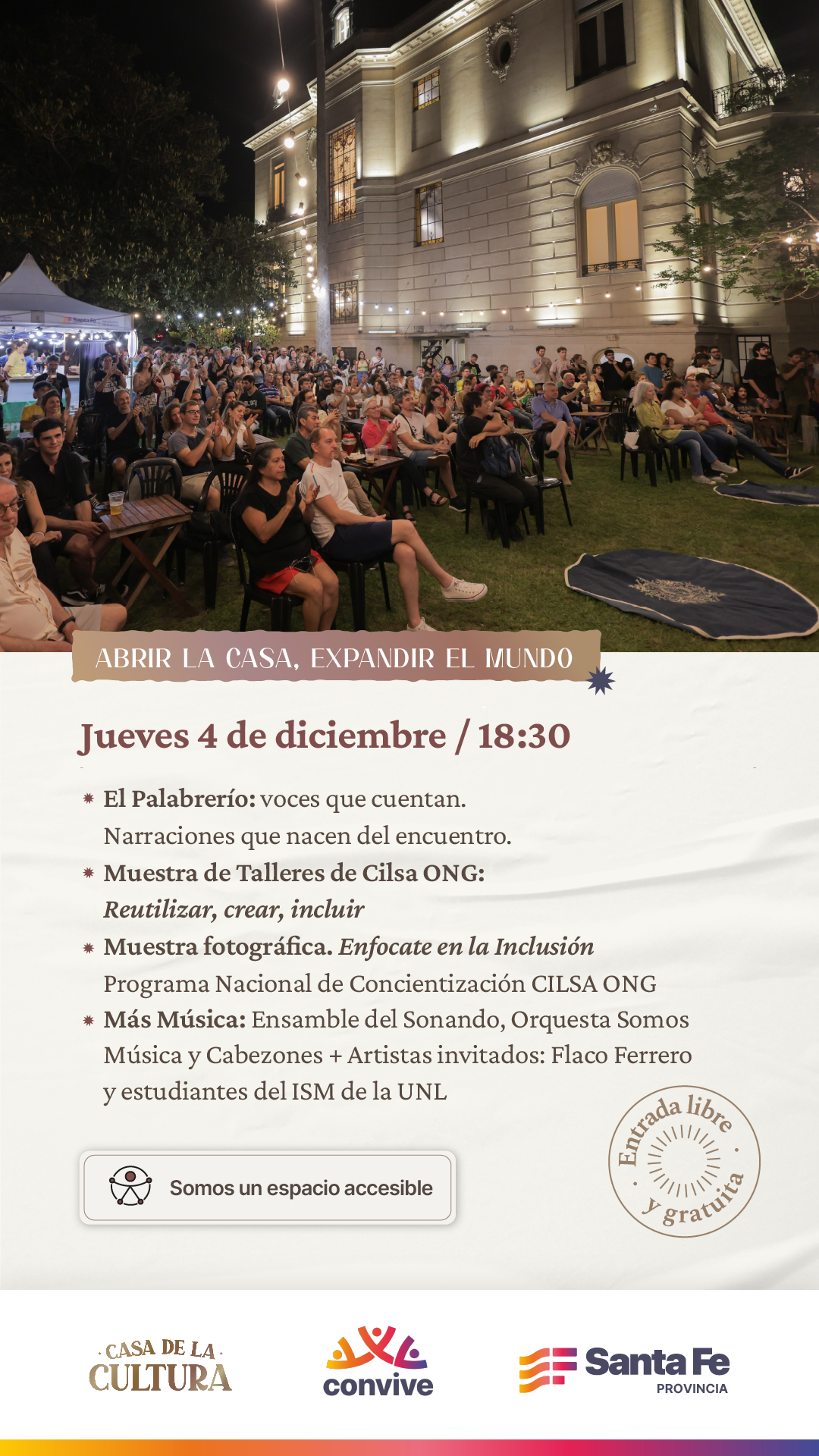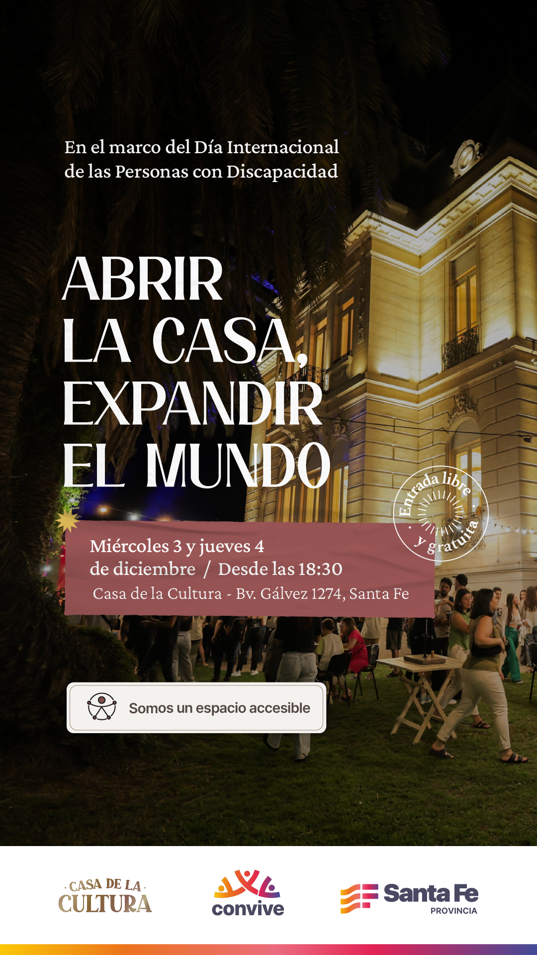 Bajo el título Abrir La Casa, expandir el mundo el Gobierno de la Provincia de Santa Fe invita a la comunidad a ser parte de actividades y diversas propuestas culturales que tendrán lugar el miércoles 3 y jueves 4 de diciembre desde las 18:30h en el espacio ubicado en Bv. Gálvez 1274. La entrada es libre y gratuita.