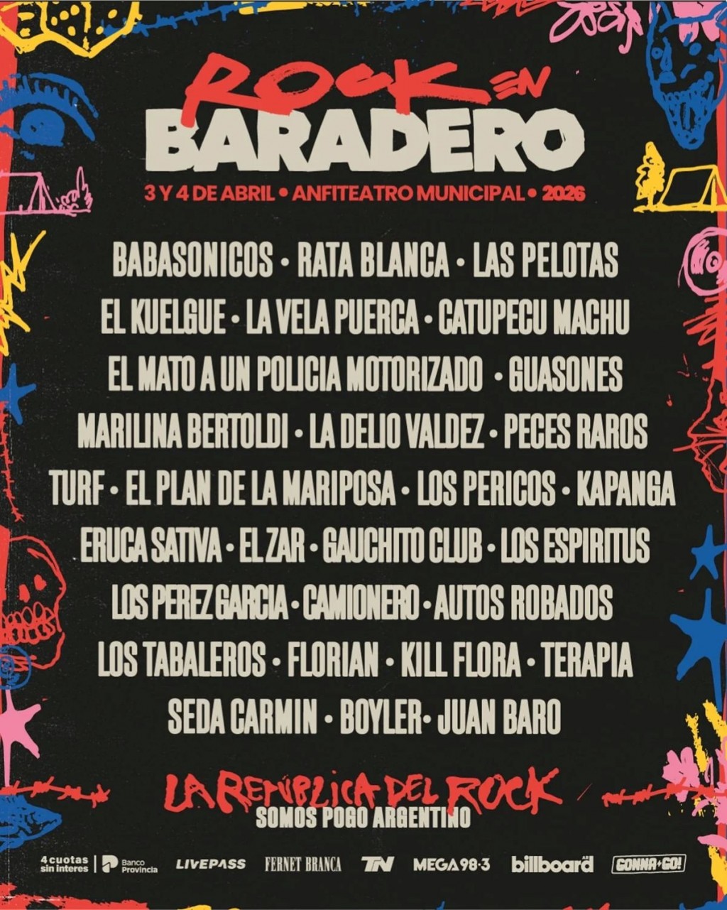 Babasonicos, Rata Blanca, Las Pelotas, Catupecu Machu, Kapanga, Guasones, Turf, Los Pericos y La Vela Puerca serán algunos de los artistas que participarán el 3 y el 4 de abril de 2026 del ya clásico festival Rock en Baradero. Además de estos grupos, se presentarán El Mato a un Policia Motorizado, Peces Raros, El Kuelgue, La Delio Valdez, Marilina Bertoldi, El Plan de la Mariposa, Eruca Sativa y El Zar. La cita será en el Anfiteatro Municipal de la localidad del norte bonaerense. Las entradas están a la venta a través de LivePass.