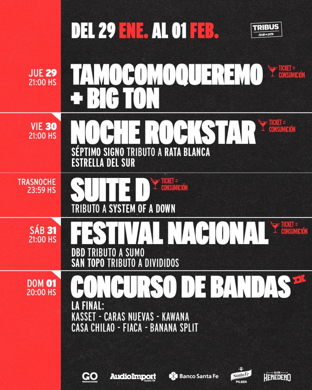 El domingo 1 de febrero a las 20 h, llega la esperada final del Concurso de Bandas 2026 con los shows de Kasset, Caras Nuevas, Kawana, Casa Chilao, Fiaca y Banana Split. Entradas a la venta en boletería de Tribus y a través de Ticketway.