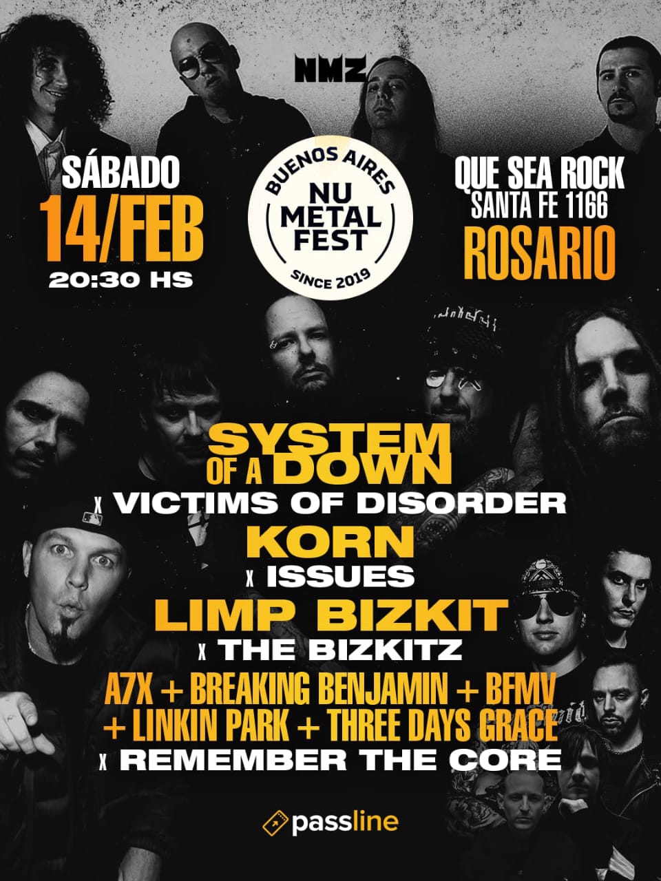 SÁBADO 14 DE FEBRERO: Buenos Aires Nu Metal Fest ​El festival que revive la era dorada del Nu Metal llega a Rosario para una noche de pura adrenalina. ​Horario: 20:30 hs. ​Line-up: ​Victims of Disorder (Tributo a System of a Down) ​Issues (Tributo a Korn) ​The Bizkitz (Tributo a Limp Bizkit) ​Remember the Core (Set especial de A7X, Linkin Park, Breaking Benjamin y más). ​Tickets: Disponibles en Passline.