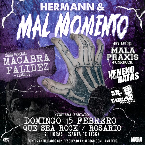​DOMINGO 15 DE FEBRERO: Hermann & Mal Momento ​Víspera de feriado a puro Punk Rock nacional. ​Horario: 21:00 hs. ​Show especial: "Macabra Palidez" + Clásicos. ​Invitados: Mala Praxis, Veneno para Ratas y Sr. Tablón. ​Anticipadas: AlPogo.com y Amadeus Rock.