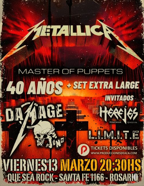 ?20:30 hs - Especial Metallica: Damage Inc. celebra los 40 años de Master of Puppets con un set extra largo. Invitados: Herejes (Homenaje a Hermética) y L.I.M.I.T.E.