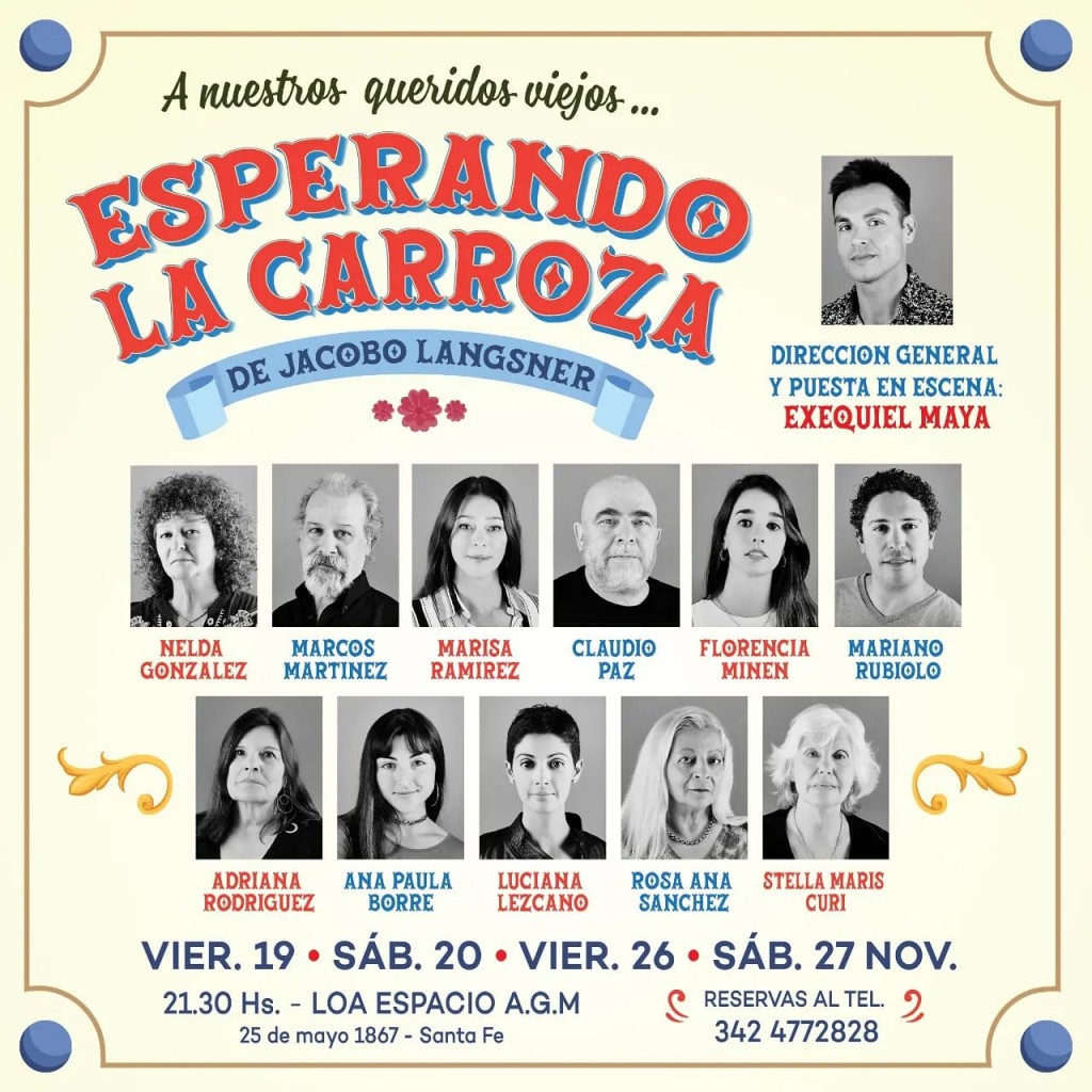 Luego de 2 años de ensayos virtuales y presenciales, sube a escena "Esperando la carroza" de Jacobo Langsner, con dirección de Exequiel Maya. La cita es el viernes 19 a las 21.30 h en la sala de la Asociación Gremial Médica