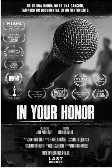 Acerca de In Your Honor In Your Honor está conformada por Juan Pablo Sanzi, Martín Legovich, Ezequiel Gonalez, Nicolás Zanotti, Marton Fabbrizzi y Marco Ruberto. El proyecto se planteó para lanzarse a principios del 2020, pero debido a la pandemia del COVID-19 quedó postergado, lo que posibilitó que pudieran aprovechar ese tiempo para seguir con las composiciones y así grabar su primer trabajo discográfico “Go On”, que cuenta con seis canciones. El documental fue presentado y seleccionado en más de veinte festivales internacionales de cine independiente, por lo que resultó ganador de tres importantes premios, además de menciones honoríficas. Ganador "Best Feature Documentary" - Miami Independent Film Fest Ganador "Best Documentary Featurette" - Festigious International Film Festival Ganador "Best Opera Prima - Feature Film" - Five Continents International Film Festival Menciones honoríficas como "Best Feature Documentary" en Onirios Films Awars, Independent Shorts Award y NYIFA (Nueva York International Film Awards).