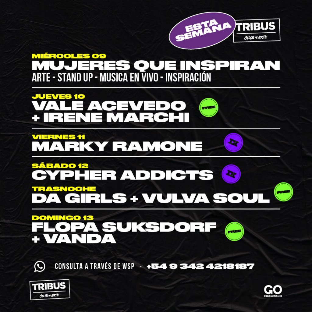 El domingo 13 de marzo a las 21, Flopa Suksdorf & The Groovin' Nation y Vanda, presentarán sus propuestas en el escenario de Tribus. Flopa y su banda tocarán composiciones de mujeres con el groove y el poder femenino como premisa, en tanto que Vanda interpretará canciones propias y versiones en formato dúo. Entrada libre y gratuita.