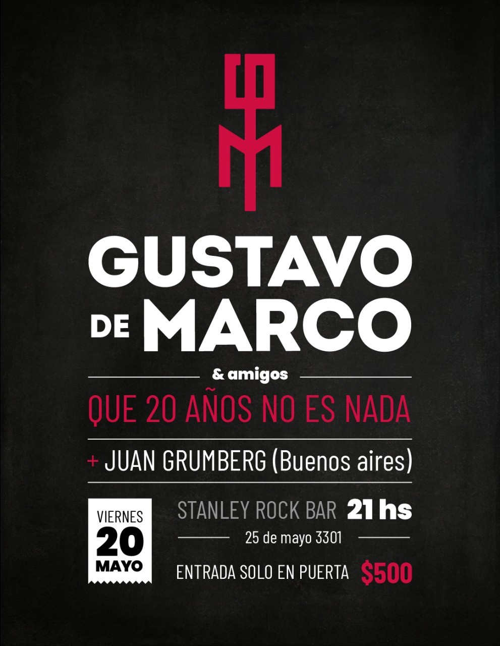 Gustavo inicia su excursion musical en el 2002 tocando en escuelas y clubes de barrio. Sus primeros recuerdos arriba de las tablas se remontan a la escuela secundaria tocando en los actos escolares. Desde allí hasta el día de hoy paso por cientos de escenarios de su ciudad natal, santa fe, recorriendo el interior de la provincia y las grandes ciudades del pais. “es el momento de festejar y celebrar la larga vida sobre las tablas” la cita es este 20 de mayo a las 21 hs en STANLEY bar, lugar que lo vio nacer en vivo como solista en el año 2012 con la presentación de su primer disco LEJOS DE AMAR. Será una noche llena de invitadxs en donde Gustavo recorrerá gran parte de las canciones que son parte de sus 3 discos de estudio.