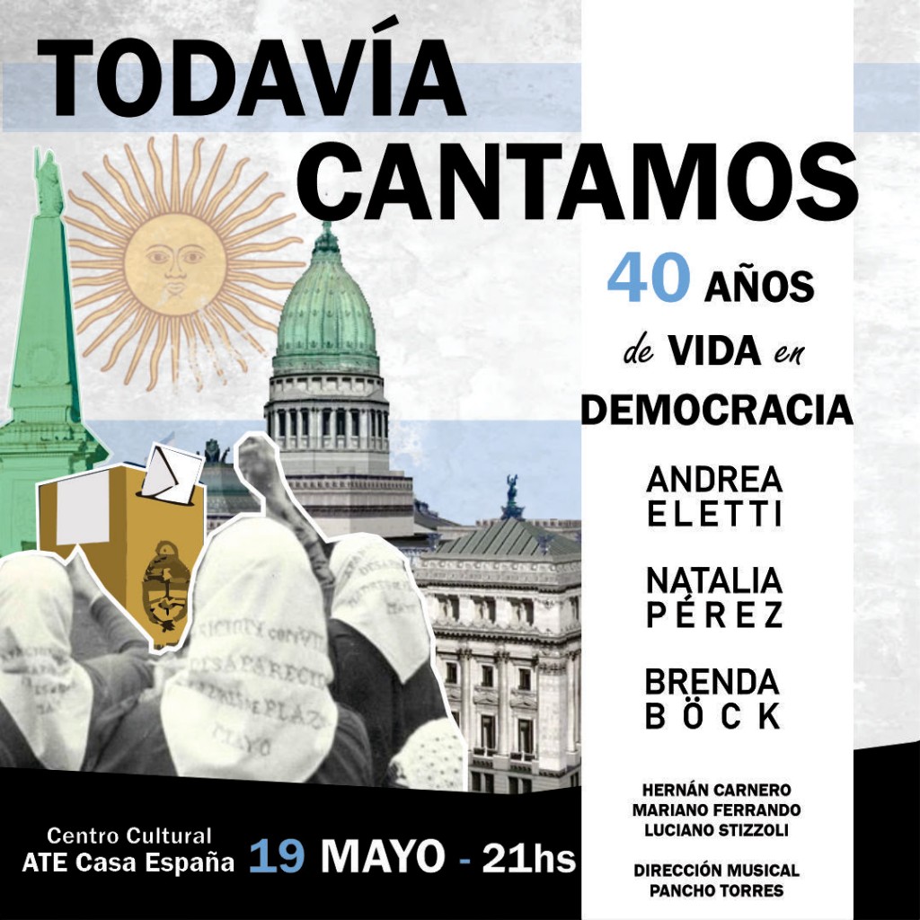 El viernes 19 de mayo, desde las 21 hs, tendrá lugar “Todavía Cantamos: 40 años de vida en Democracia”, en el Centro Cultural ATE Casa España (Rivadavia 2871).