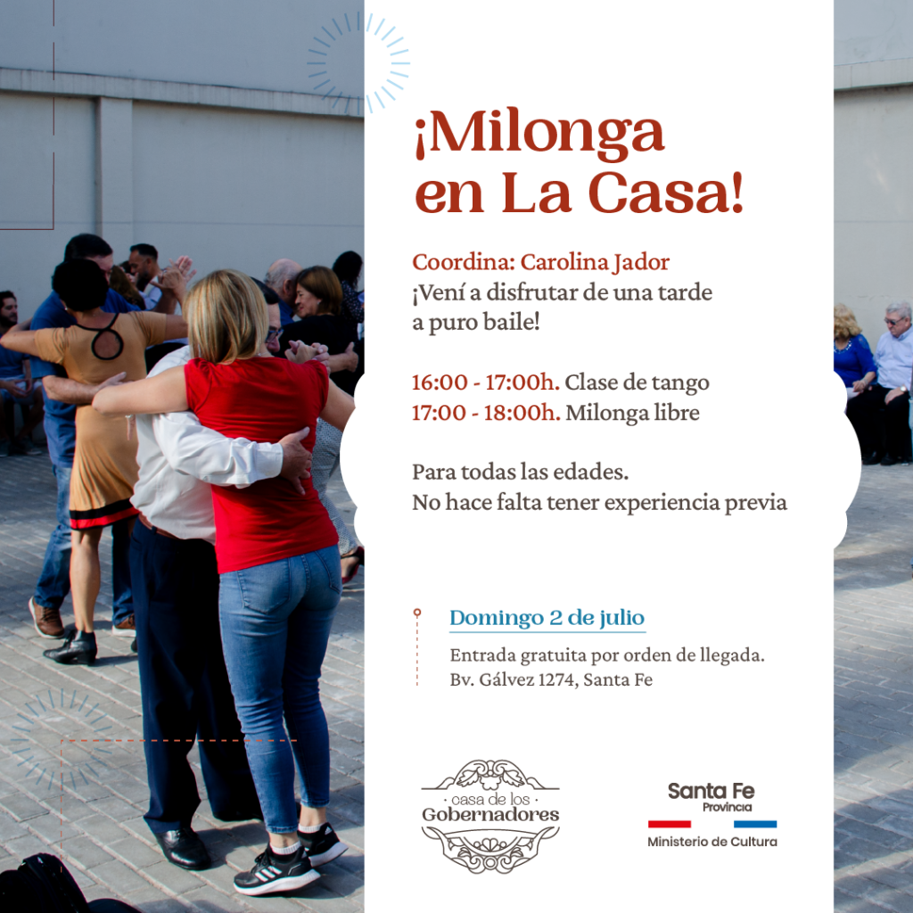 La Casa de los Gobernadores, organismo dependiente del Ministerio de Cultura de la Provincia de Santa Fe, invita a la comunidad a ¡Milonga en La Casa!, una propuesta coordinada por la bailarina, coreógrafa y profesora de tango Carolina Jador, quien facilitará herramientas para introducir al público en el universo del tango. La actividad inicia a las 16h. con una clase de tango que se extenderá hasta las 17h. y, posteriormente, de 17 a 18h., los participantes podrán disfrutar de milonga libre.