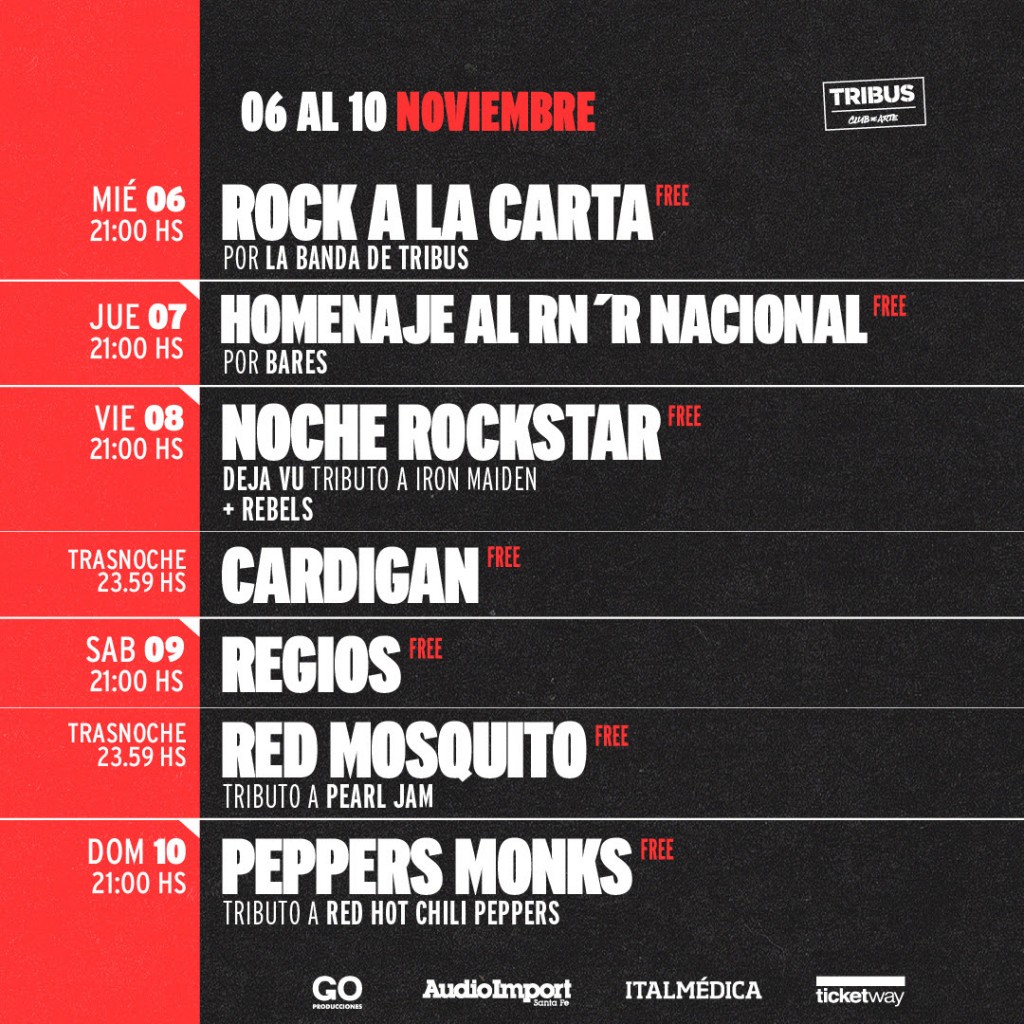 El miércoles 6 de noviembre a las 21 hs, La Banda de Tribus presenta Rock a la Carta, con todos los clásicos del rock nacional y mucho más. Entrada libre y gratuita.