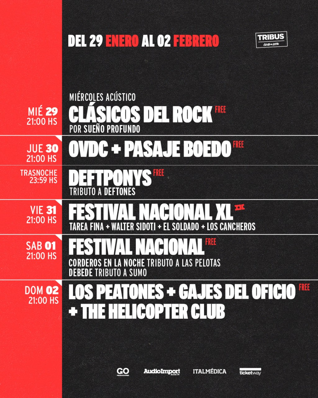 El viernes 31 de enero a las 21 hs, toda la mística ricotera llega a Tribus con el Festival Nacional XL y los shows de Tarea Fina junto a Walter Sidoti, y El Soldado. Como invitados estarán Los Cancheros (tributo a Los Piojos) Entradas a la venta en boletería y a través de Ticketway.