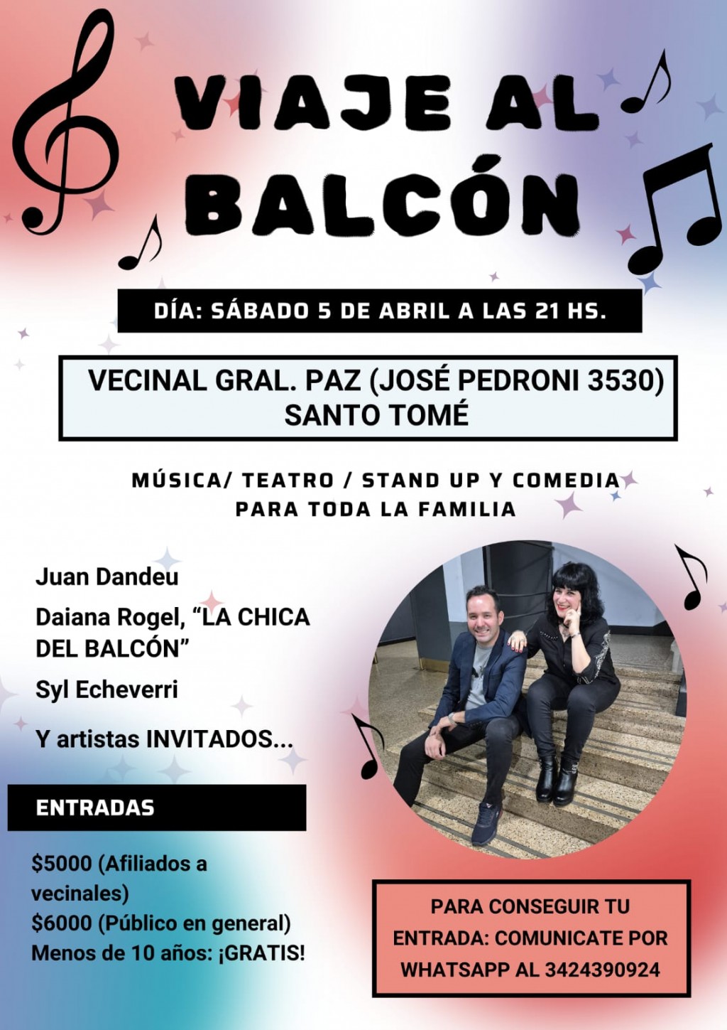 El sábado 5 de abril a las 21 hs llega “Viaje al Balcón” a la Vecinal General Paz de Santo Tomé. Un espectáculo para toda la familia con Daiana Rogel (La Chica del Balcón), Juan Dandeu y la locución de Syl Echeverri de @983.mega. Música en vivo, comedia, baile y sorpresas.