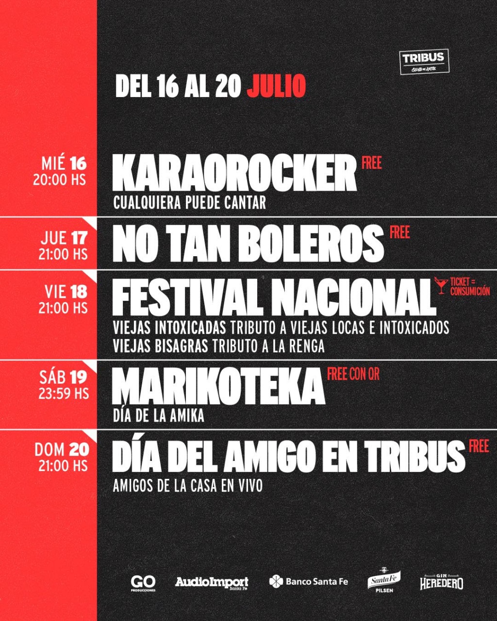 El viernes 18 de julio a las 21 h, llega una nueva edición del Festival Nacional con los shows de Viejas Intoxicadas (homenaje a Viejas Locas e Intoxicados) y Viejas Bisagras (tributo a La Renga). Adquirí tu ticket válido por una consumición en la boletería de Tribus.