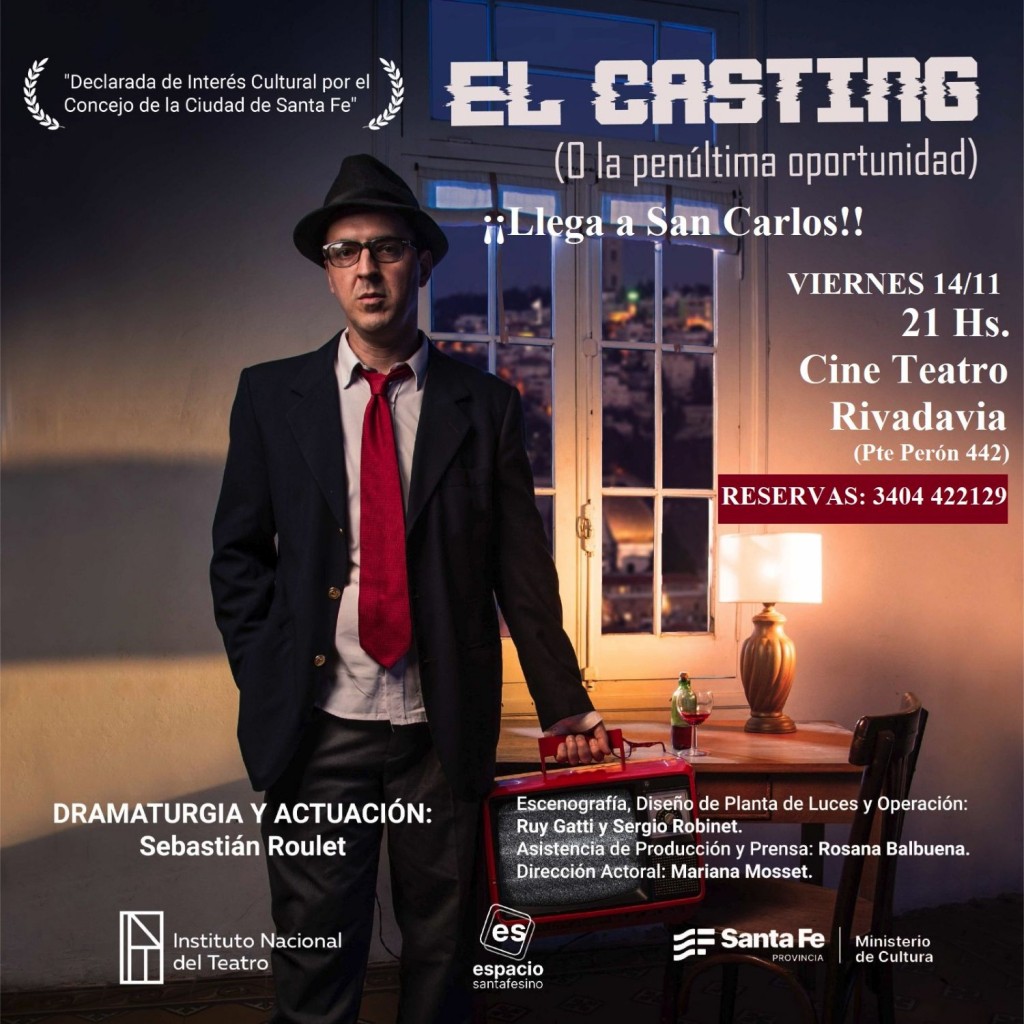 "El Casting (O la penúltima oportunidad)" de Sebastián Roulet se presentará el viernes 14 de noviembre a las 21 hrs el Cine Teatro Rivadavia de San Carlos, ubicado en Pte. Perón 442.