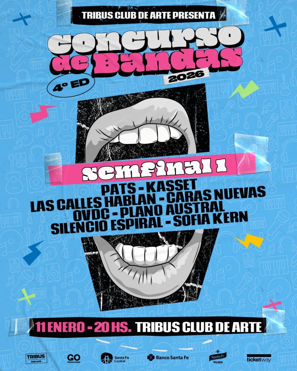 Este domingo 11 de enero desde las 20 h, llega la primera semifinal de la cuarta edición del Concurso de Bandas de Tribus Club de Arte con los shows de Pats, Kasset, Las Calles Hablan, Caras Nuevas, OVDC, Silencio Espiral y Sofía Kern.